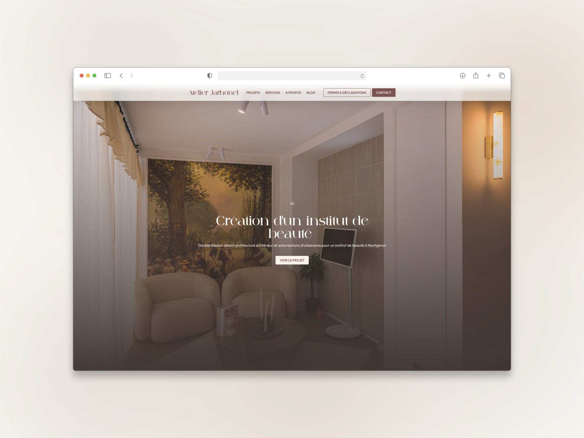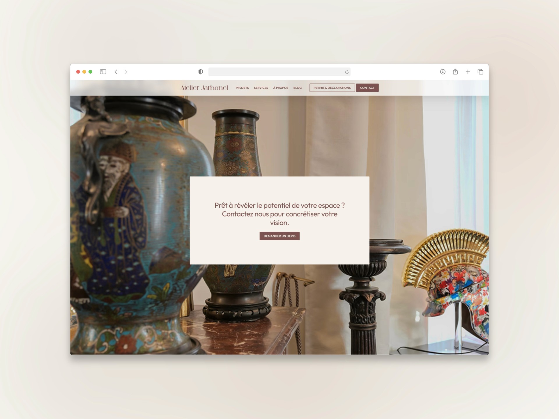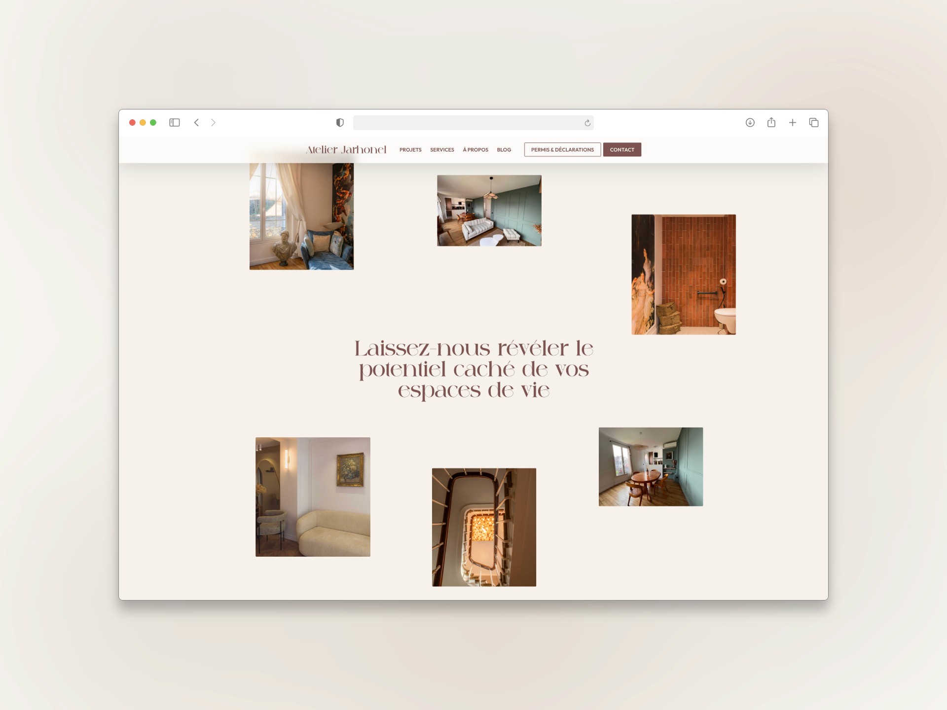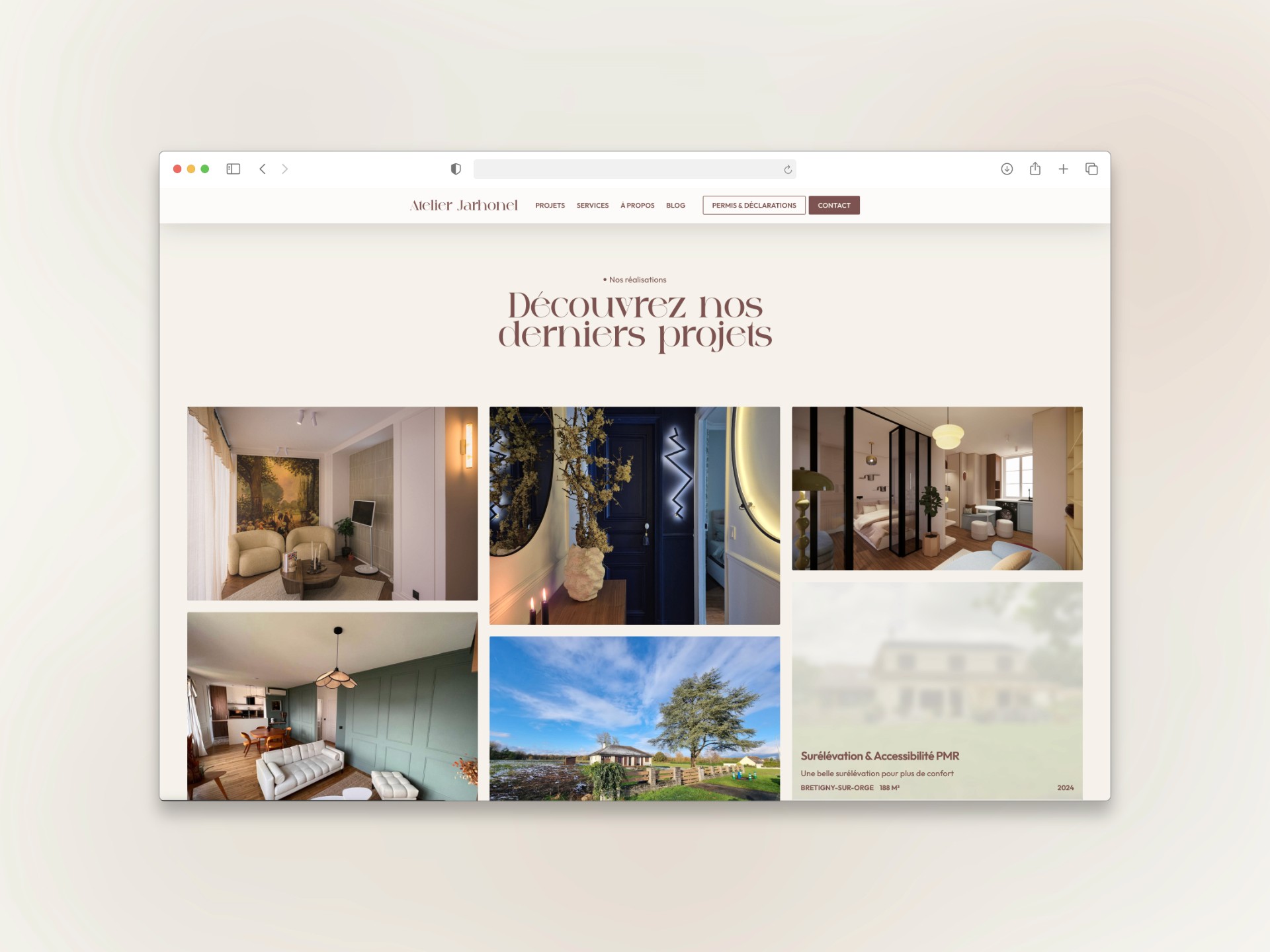 Comment traduire digitalement la qualité d'un travail essentiellement physique et sensoriel ? Il fallait créer un site web capable de faire ressentir l'atmosphère des projets, la finesse du travail architectural et l'exigence de l'atelier, sans que l'interface ne prenne le pas sur les réalisations. L'enjeu : concevoir une vitrine digitale aussi soignée que les intérieurs signés Jarhonel.